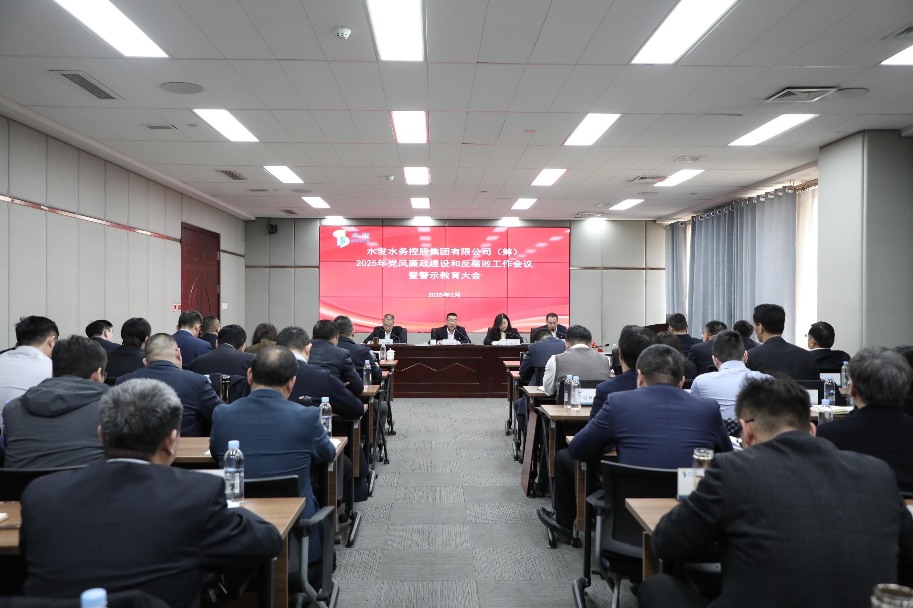 水發(fā)水控集團(tuán)領(lǐng)導(dǎo)班子成員、各部室負(fù)責(zé)人、各區(qū)域公司總經(jīng)理、各權(quán)屬公司黨支部書記,總部及各區(qū)域公司黨員代表、水控集團(tuán)總部紀(jì)委全體人員等60余人參加會議。